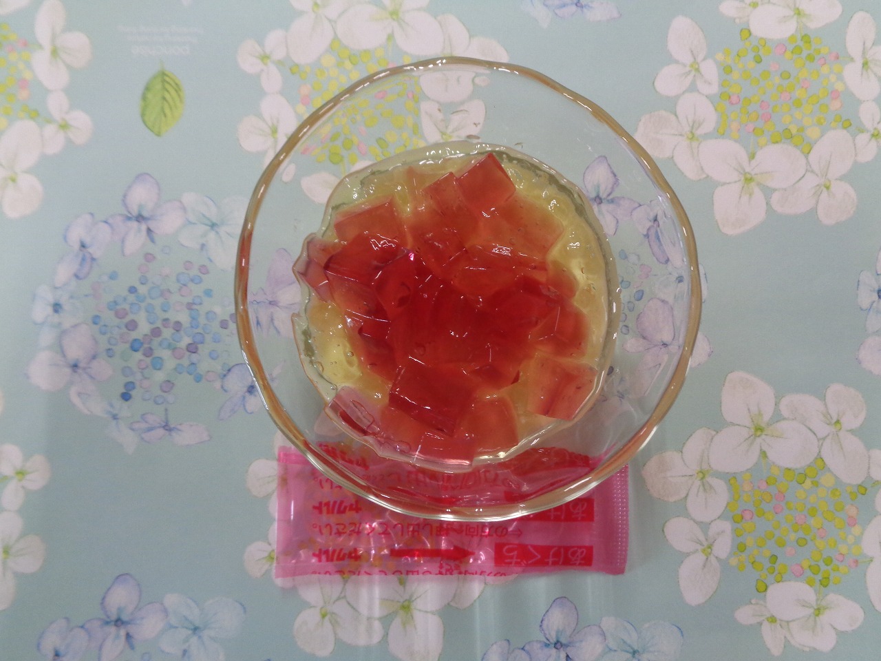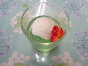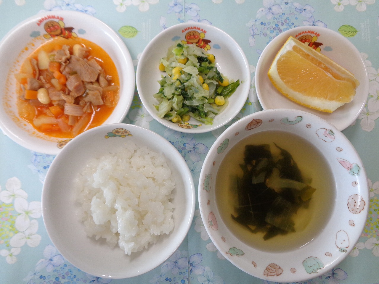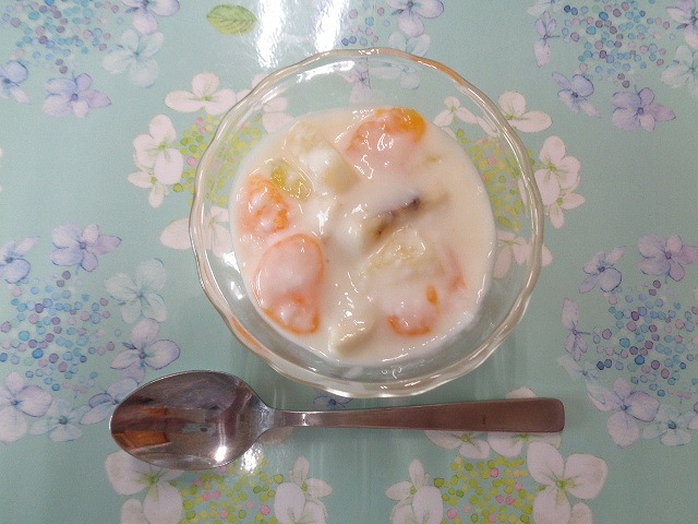 1日の給食は『ポークビーンズ・しょうゆフレンチ・わかめスープ・ジューシーフルーツ』で、おやつは『あじさいゼリー』でした🌼