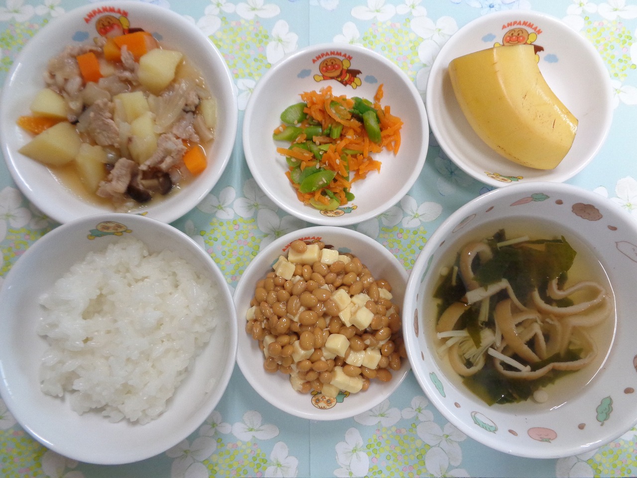 2日の給食は『肉じゃが・アスパラのごま和え・チーズ納豆・すまし汁・バナナ』でした