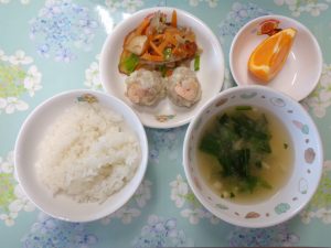 5日の給食は『エビシュウマイ・五目きんぴら・のり佃煮・みそ汁・オレンジ』でした