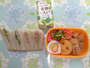 6日の給食は『詰め合わせお弁当・野菜ジュース』で、おやつは『フルーチェ』でした。気になるお弁当の中身は、子ども達が大好きな唐揚げ🍗やフライドポテト🍟やサンドイッチ🥪 みんな喜んで食べていました