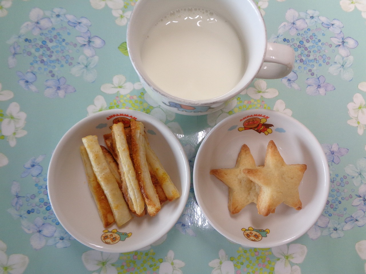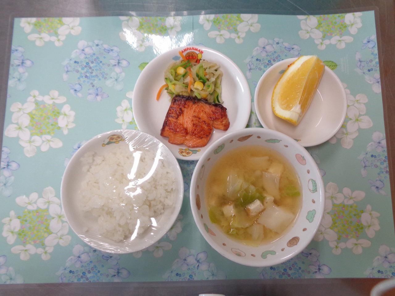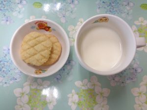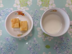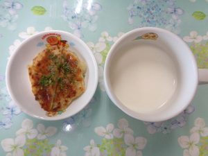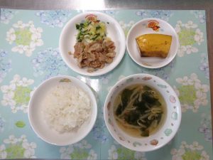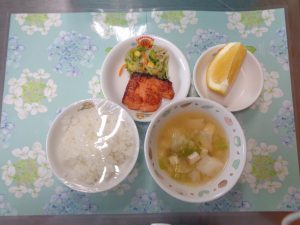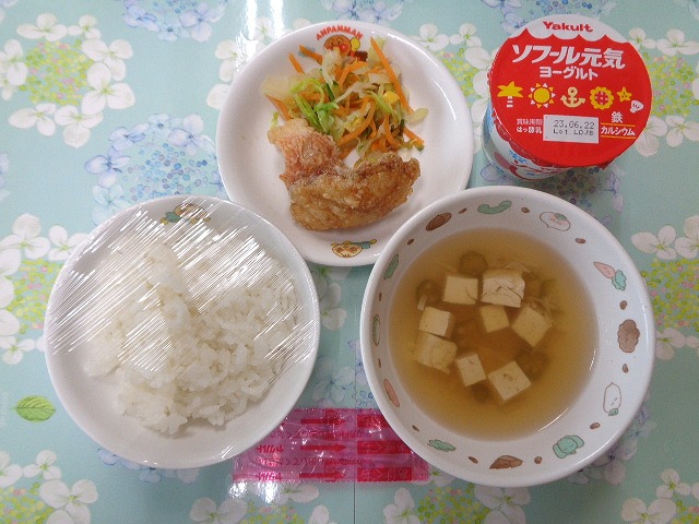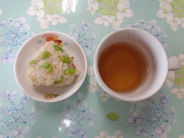 22日の給食は『赤魚の甘辛揚げ・野菜サラダ・すまし汁・ヨーグルト』で、おやつは『枝豆おにぎり・麦茶』でした。プラネタリウムに行った年長さんより、「お弁当もおいしかったよ!!」とのことです