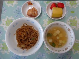 8日の給食は『焼きそば・照り焼きチキン・みそ汁・バナナ・いちご』で、おやつは『焼きおにぎり・麦茶』でした。お米の配達を頼んでいる農家の方に「よつぼし」という品種のいちごをいただきました🍓