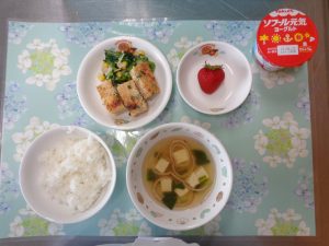 9日の給食は『つくね焼き・オクラの和え物・すまし汁・ヨーグルト・いちご』でした