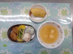 12日の給食は『おにぎり・根菜バーグ・ゆかり和え・みそ汁・バナナ』でした