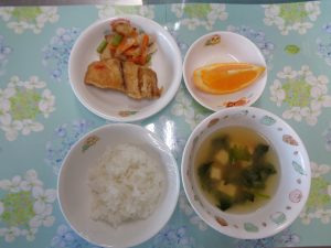 13日の給食は『アジの南蛮漬け・みずのけんちん・みそ汁・オレンジ』で、おやつは『フロートゼリー』でした