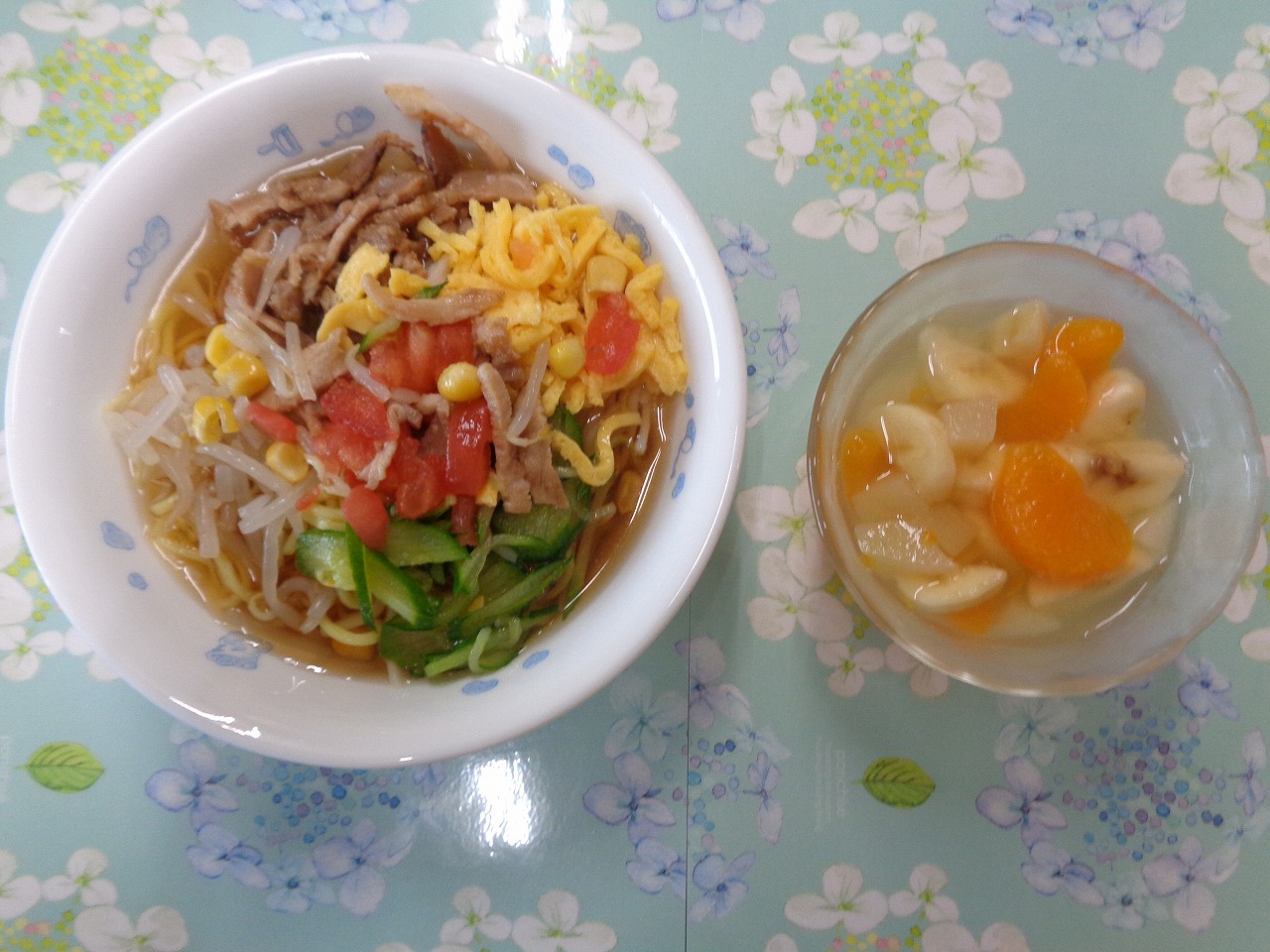 14日の給食は『冷やし麺バイキング・フルーツポンチ』で、おやつは『チーズパイ・クッキー・牛乳』でした。麺はうどんと中華麺の2種類で、おかわりで好きな方を選んで食べました