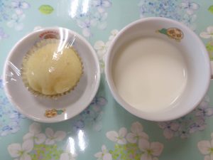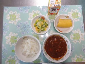 15日の給食は『ハヤシライス・アスパラサラダ・キャロットジュース・バナナ』で、おやつは『チーズ蒸しパン・牛乳』でした🧀