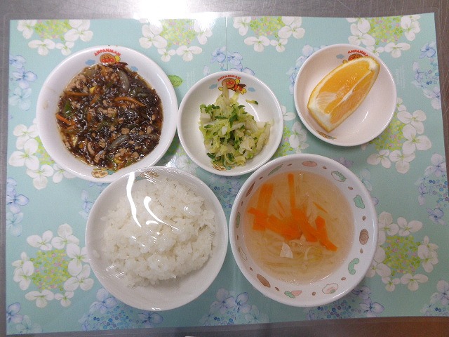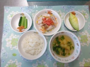 16日の給食は『もずく丼風・お浸し・春雨スープ・ジューシーフルーツ』でした