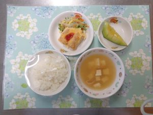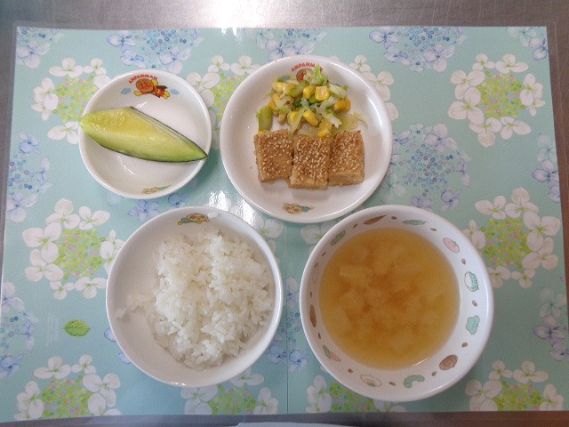 28日の給食は『松風焼き・アスパラのお浸し・みそ汁・メロン』で、おやつは『フルーツヨーグルト』でした🍍🍊🍌🍈