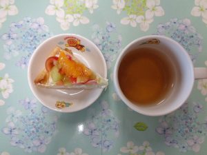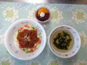 20日の給食は『タコライス・わかめスープ・ゼリーアラモード』で、おやつは『フルーツタルト・麦茶』でした🎂