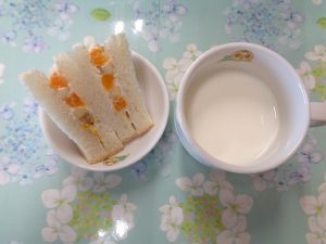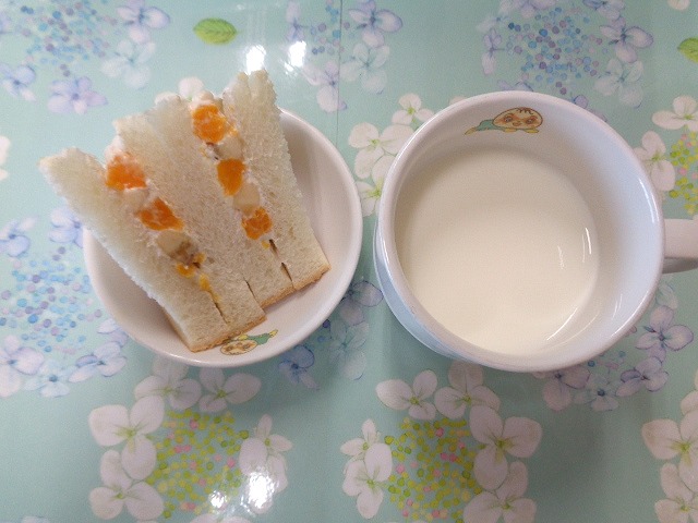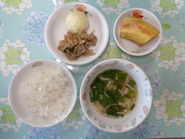 21日の給食は『豚肉の生姜焼き・コーンポテト・みそ汁・バナナ』で、おやつは『フルーツサンド・牛乳』でした🍌🍊🍞