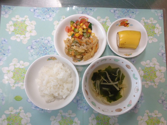 23日の給食は『チャプチェ風・トマトサラダ・中華スープ・バナナ』でした