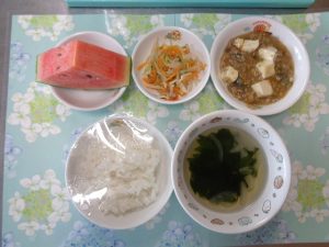 29日の給食は『ご飯・麻婆ナス・もやしのナムル・中華スープ・すいか』で、おやつは『お好み焼き・牛乳』でした。今日のすいかは『ピノ・ガール』という品種で、タネまで食べられるのが特徴です🍉