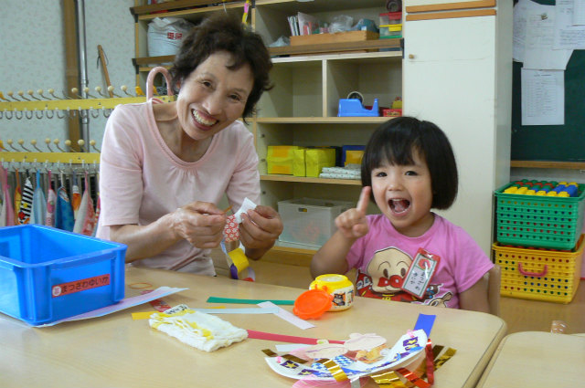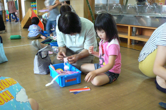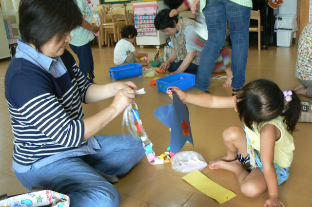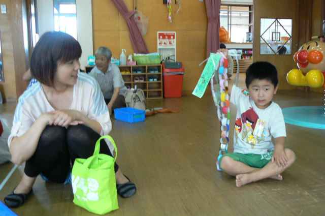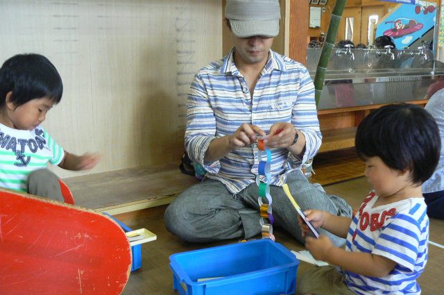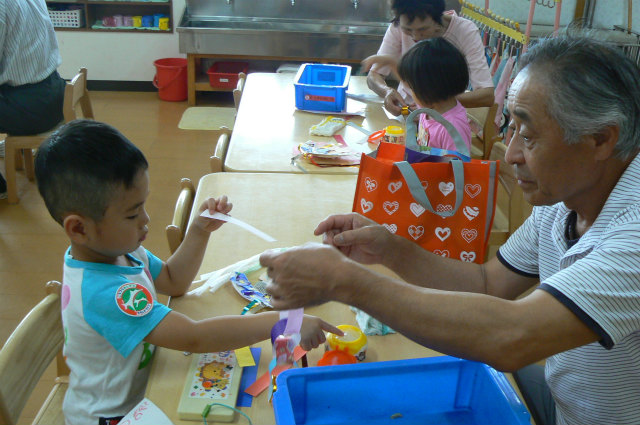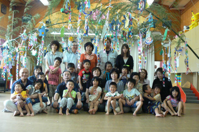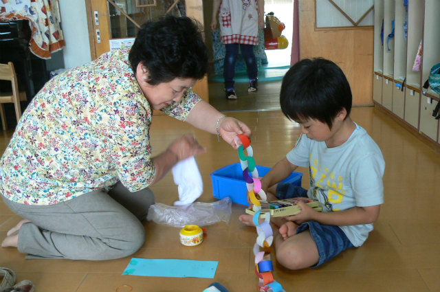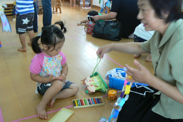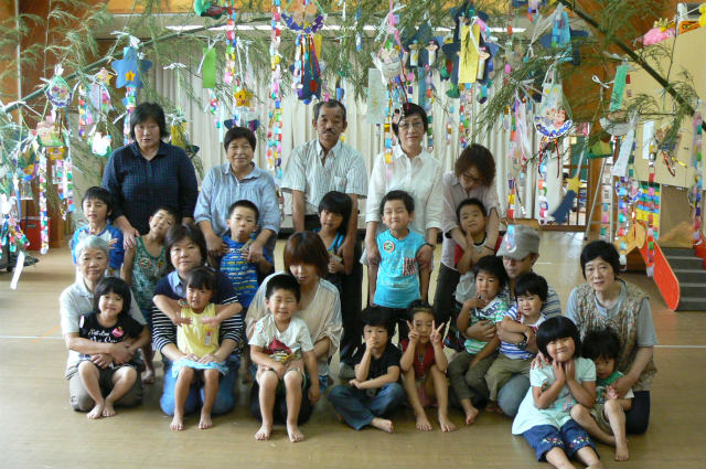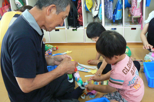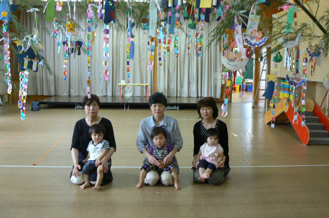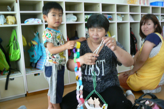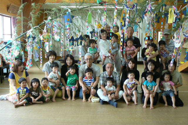 毎年この日は保育園におじいちゃんやおばあちゃんが来園し、一緒に七夕飾り作りをしたり、短冊にお願い事を書いたりして、大きな笹竹に飾りますfutaba.gifkira01.gif
