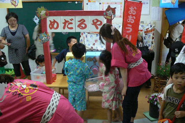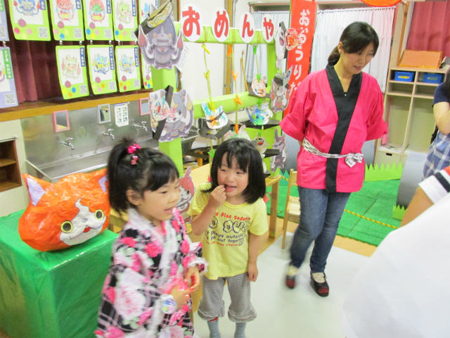 妖怪商店街には子ども達が作ったお面屋さん、メダル屋さん、時計屋さんがあり、お買い物を楽しみました