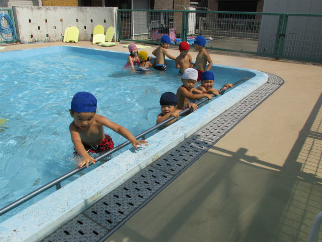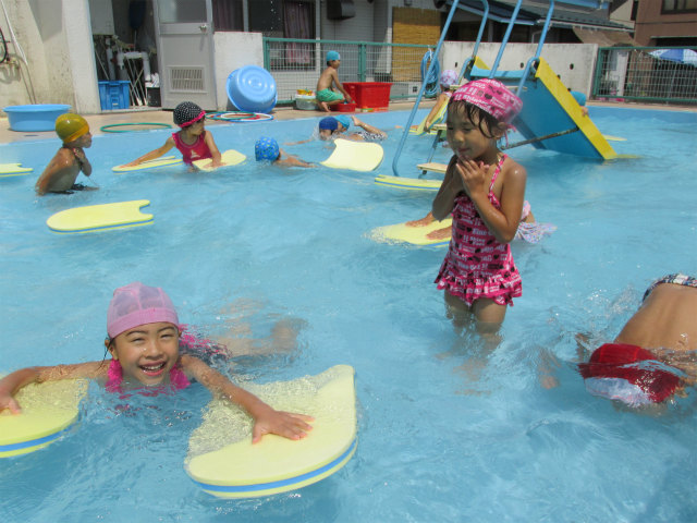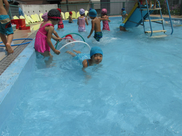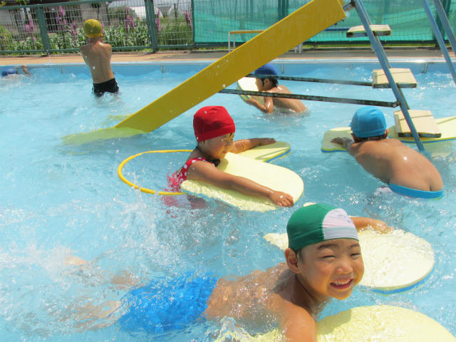 大きいプールで遊ぶゆり組さん、ばら組さんは、滑り台に挑戦したり、水しぶきをあげたり、ビート版を使って泳ぐ練習をしたり…とダイナミックに遊んでいますsee.gif