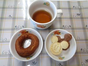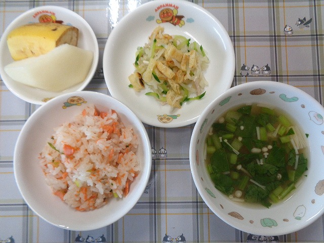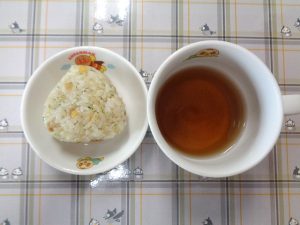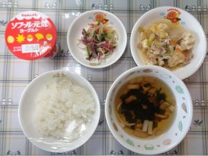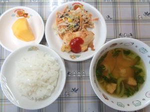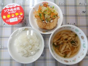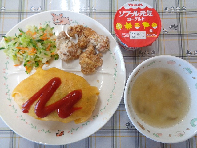 11日の給食は『オムライス・鶏のから揚げ・コールスロー・オニオンスープ・ヨーグルト』で、おやつは『クッキーorドーナツ・麦茶』でした