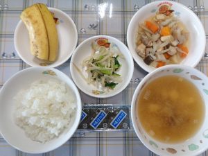 12日の給食は『豚肉の生姜焼き・ポテトサラダ・中華スープ・バナナ』で、おやつは『五平餅・麦茶』でした
