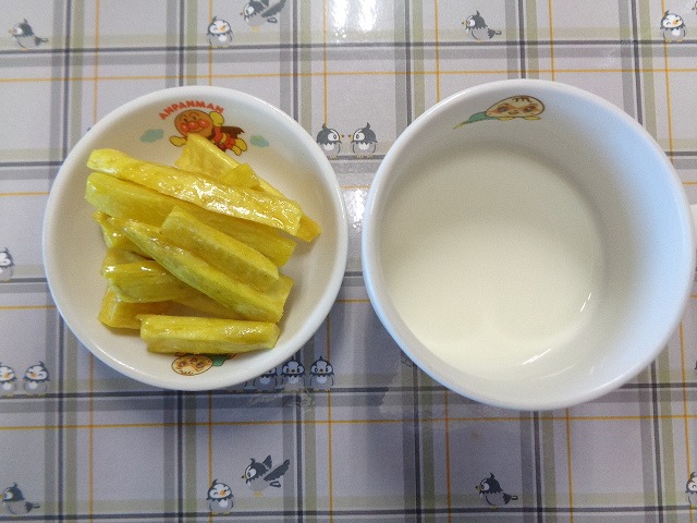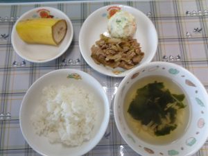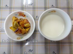 3日の給食は『ご飯・筑前煮・お浸し・なめこ汁・バナナ』で、おやつは『大学芋・牛乳』でした🍠