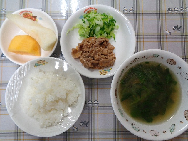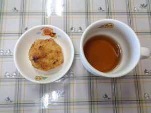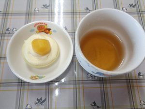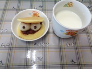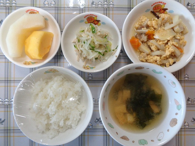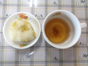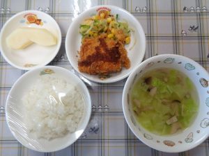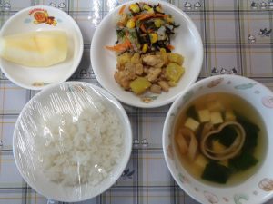 5日の給食は『トンテキ風・浅漬け・みそ汁・柿・ラフランス』で、おやつは『たぬきおにぎり・麦茶』でした。ラフランスは保護者の方より頂きました