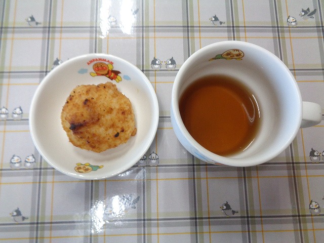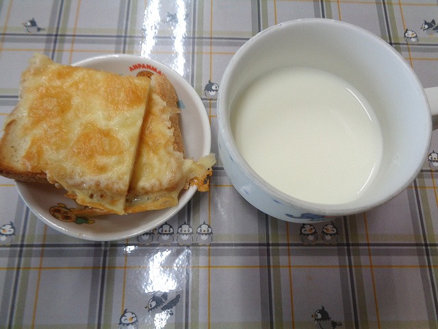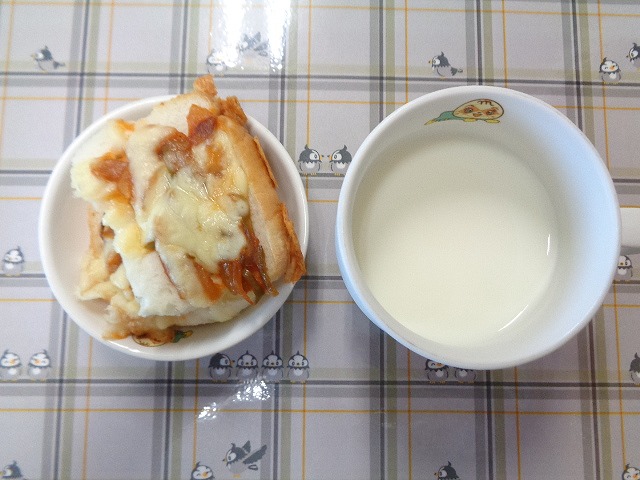19日の給食は『つくね焼き・おかか和え・みそ汁・みかん』で、おやつは『チーズトースト・牛乳』でした
