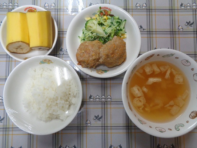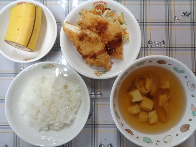 20日の給食は『ササミフライ・ごまさっぱり和え・すまし汁・バナナ』でした🍌