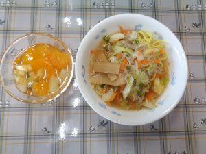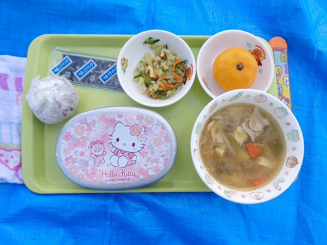 13日の給食は『芋煮汁・生姜醬油和え・味付けのり・みかん』