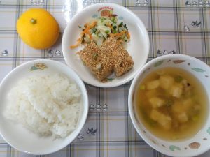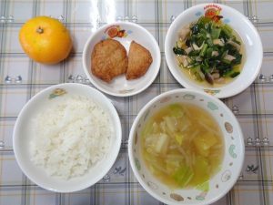 27日の給食は『手作りさつま揚げ・焼き麩入りお浸し・みそ汁・みかん』でした。保護者の方よりいいただいた、梨と柿も食べました