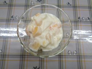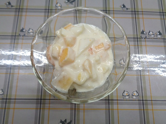 26日の給食は『親子煮・りんごと大根のサラダ・みそ汁・柿・梨』で、おやつは『フルーツヨーグルト』でした🍌🍎🍊