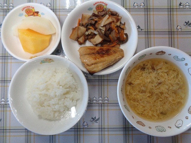 30日の給食は『さばのみそ焼き・ぜんまい炒り煮・かきたま汁・梨・柿』でした🐟