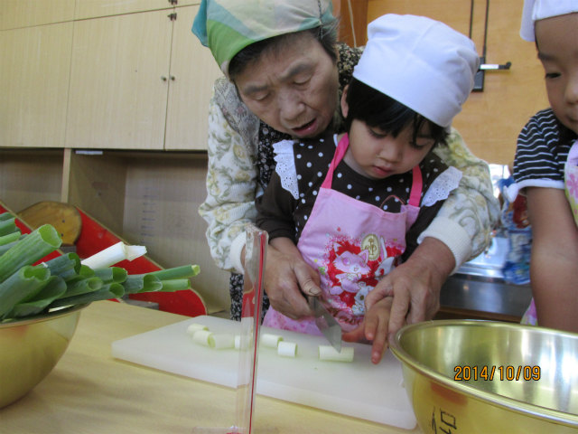 老人クラブの方々に教えてもらいながら、包丁を使って材料を切りますspoon02.gif