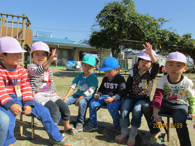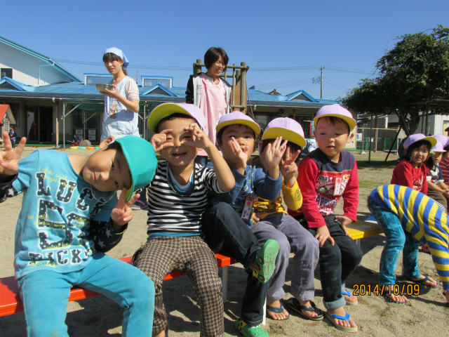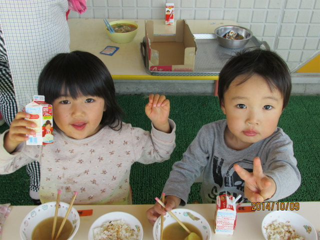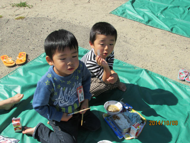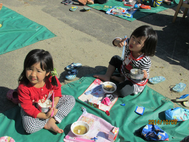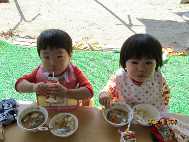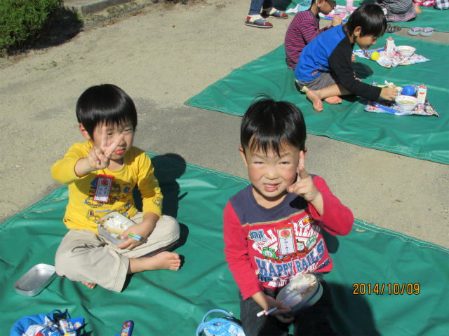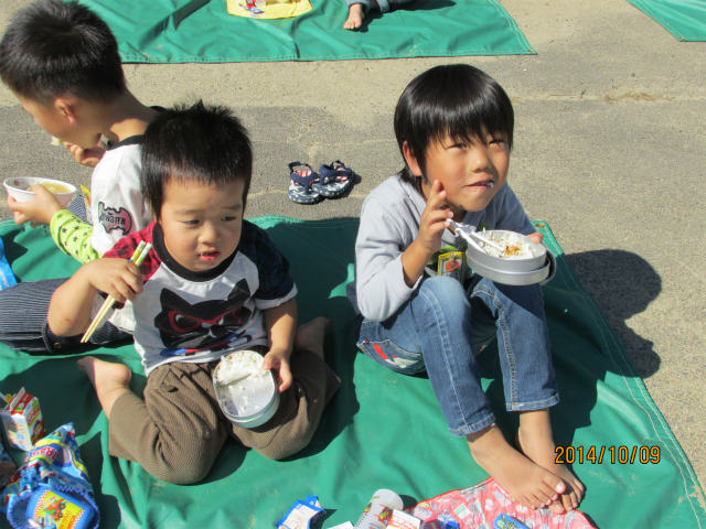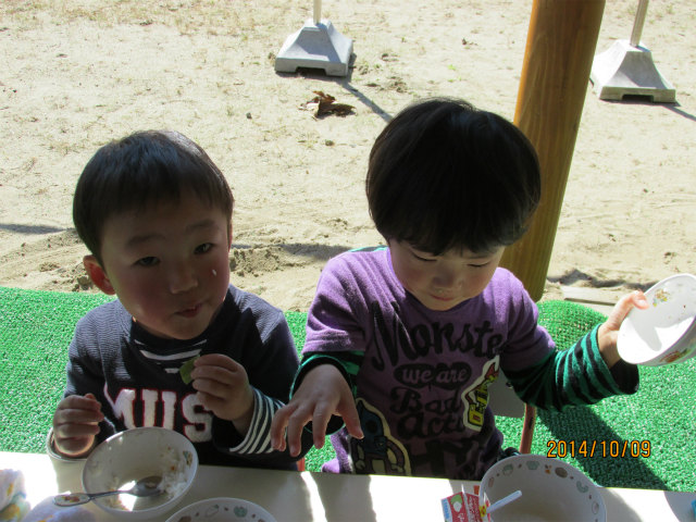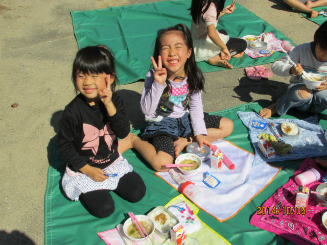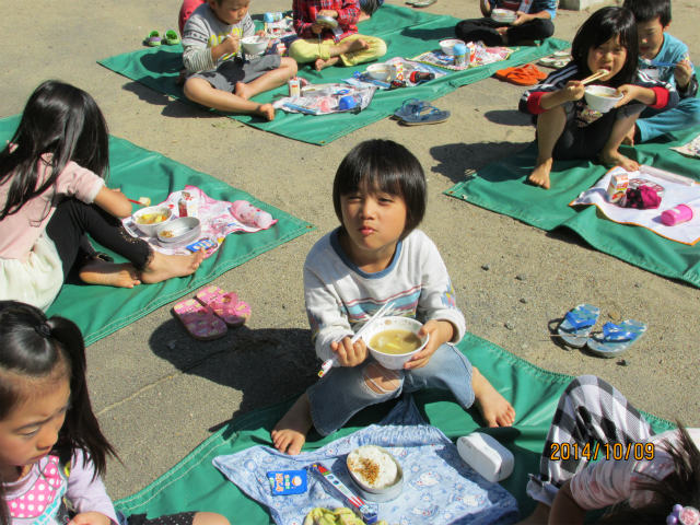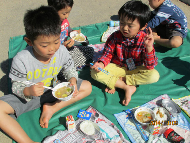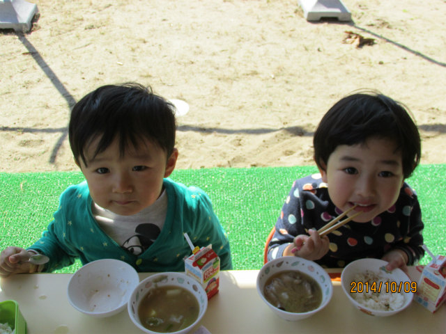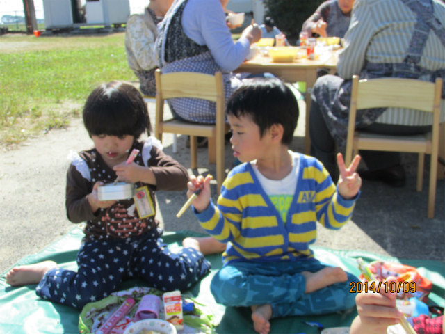 ちゅうりっぷ組さんはテラスで、ゆりさん組さん、ばら組さんは園庭にシートを敷いて老人クラブの方々と一緒に会食をしましたspoon01.gif