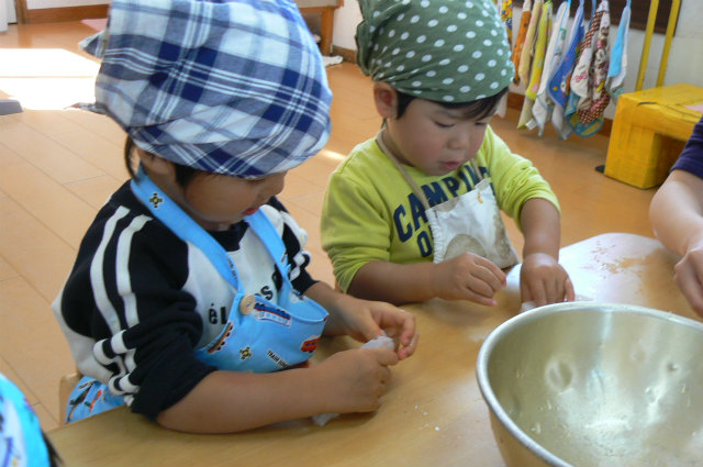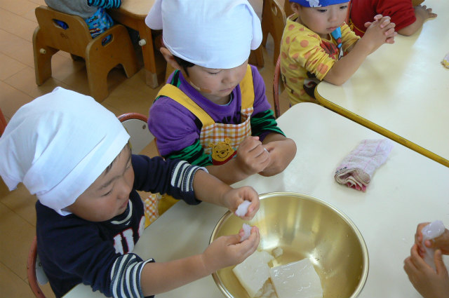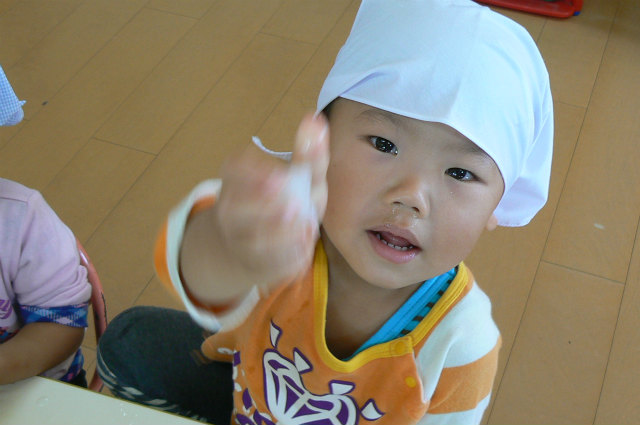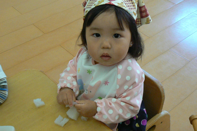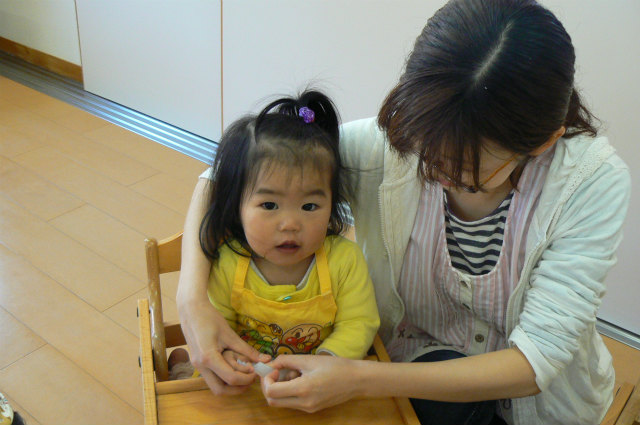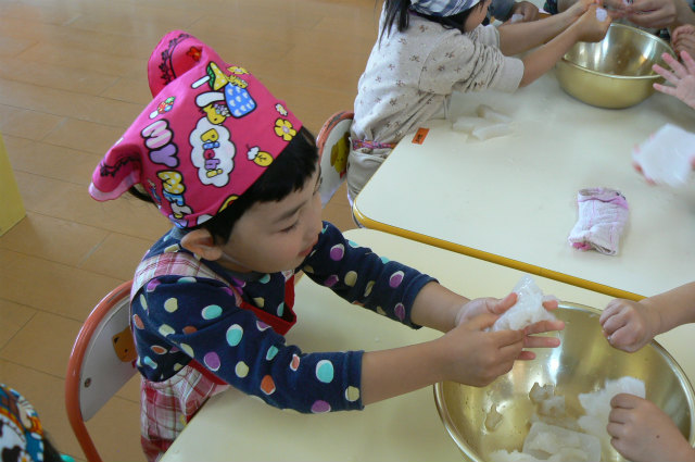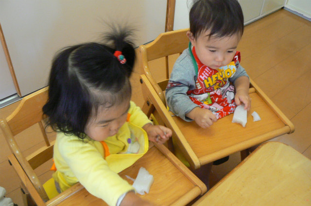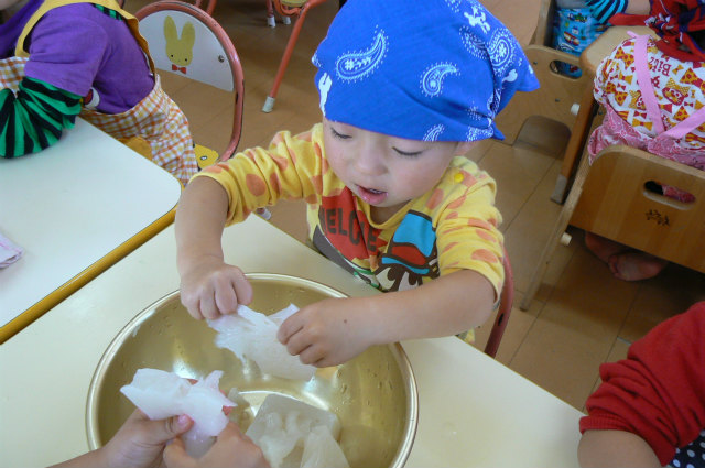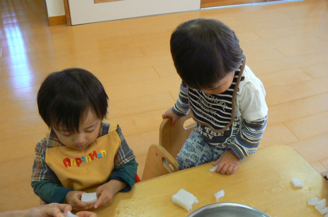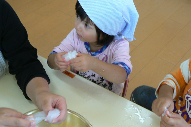 ちゅうりっぷ組さん、もも組さんはこんにゃくちぎりに挑戦kao-a05.gifbikkuri01.gif