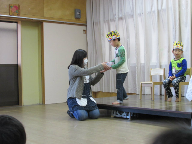 はじめに誕生児は誕生会係から冠を被せてもらいます