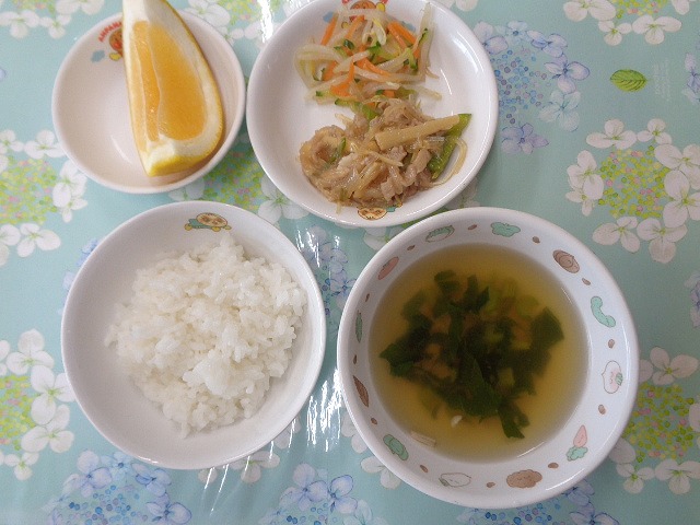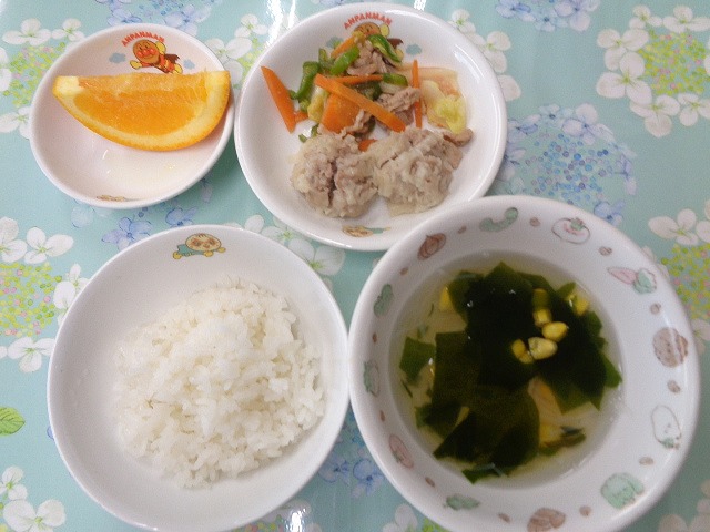 4日の給食は『シュウマイ・回鍋肉・春雨スープ・オレンジ』で、おやつは『じゃが芋のおやき・牛乳』でした