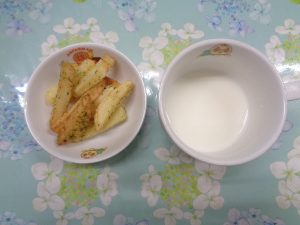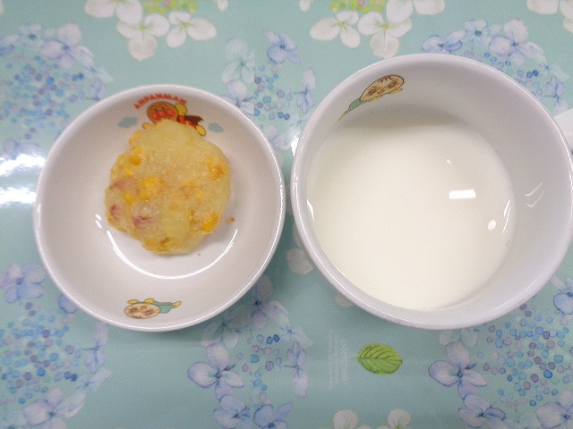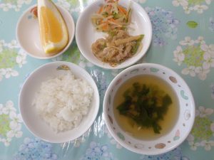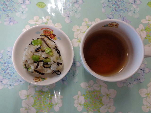 13日の給食は『アジのカレー揚げ・野菜炒め・みそ汁(ほうれん草・厚揚げ・しめじ)・ジューシーフルーツ』で、おやつは『枝豆おにぎり・麦茶』でしたおにぎり