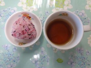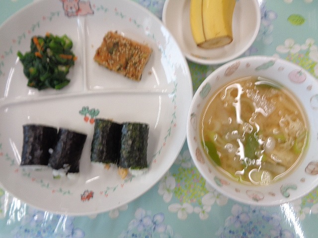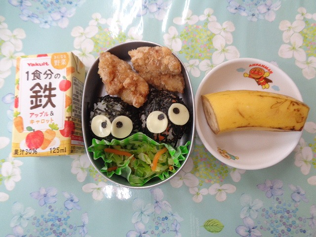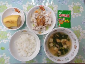 5日の給食は『詰め合わせ弁当(鮭おにぎり・わかめおにぎり・鶏の唐揚げ・ドレッシングサラダ)・野菜ジュース・バナナ』で、おやつは『いちごフルーチェ』でした