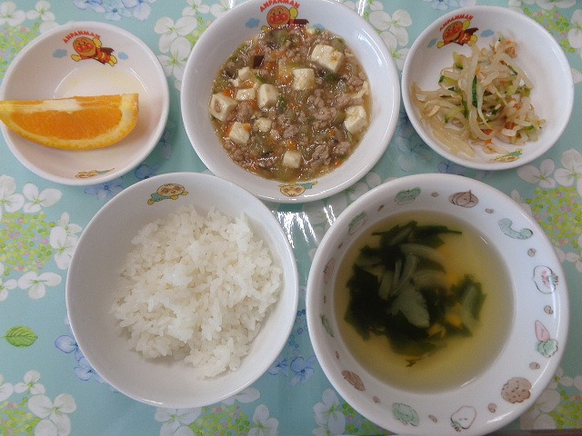 6日の給食は『麻婆豆腐・華風和え・わかめスープ・オレンジ』で、おやつは『ピザトースト・牛乳』でした