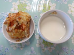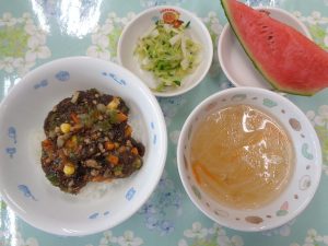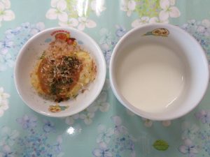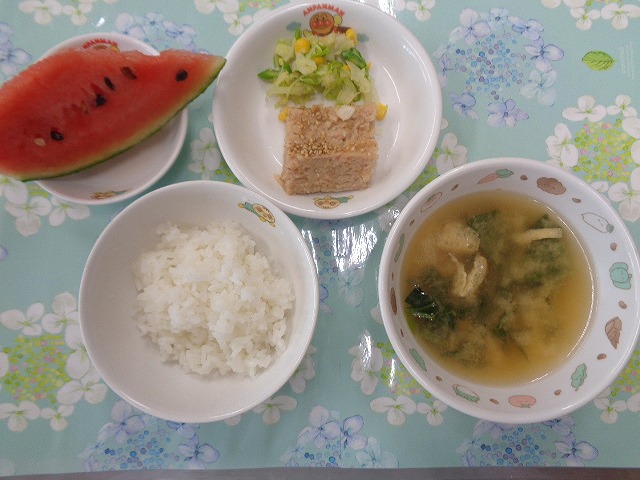 26日の給食は『松風焼き・アスパラサラダ・みそ汁(大根・薄揚げ・ほうれん草)・スイカ』で、おやつは『お好み焼き・牛乳』でした🍉