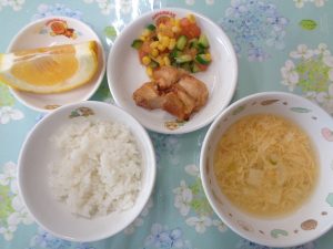 7日の給食は『鶏肉のマーマレード焼き・トマトサラダ・かきたま汁・ジューシーフルーツ』でした