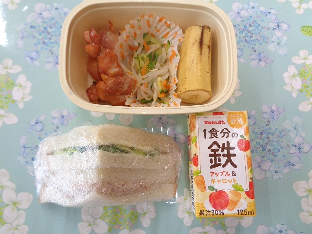 10日の給食は『サンドイッチ(きゅうり&チーズ・ツナ)・照り焼きチキン・もやしサラダ・キャロットジュース・バナナ』でした