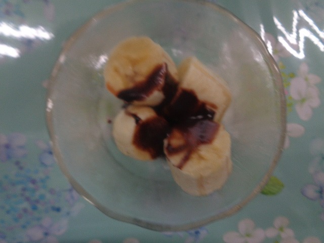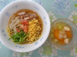 11日の給食は『チャプチェ風・ナムル・中華スープ・ジューシーフルーツ』で、おやつは『デザートバナナ』でした