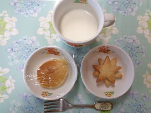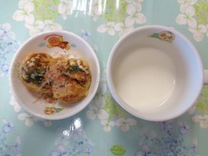 12日の給食は『細巻き(納豆・きゅうり)・つくね焼き・オクラの和え物・けんちん汁・バナナ』で、おやつは『ホットケーキorクッキー・牛乳』でした