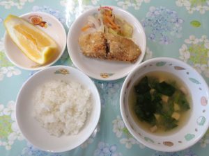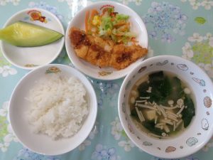 17日の給食は『ささみフライ・野菜サラダ・みそ汁(えのき・豆腐・ほうれん草)・メロン』でした🍈