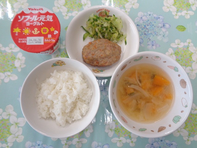 14日の給食は『根菜バーグ・ゆかり和え・みそ汁(かぼちゃ・玉葱)・ヨーグルト』でしたハートたち (複数ハート)