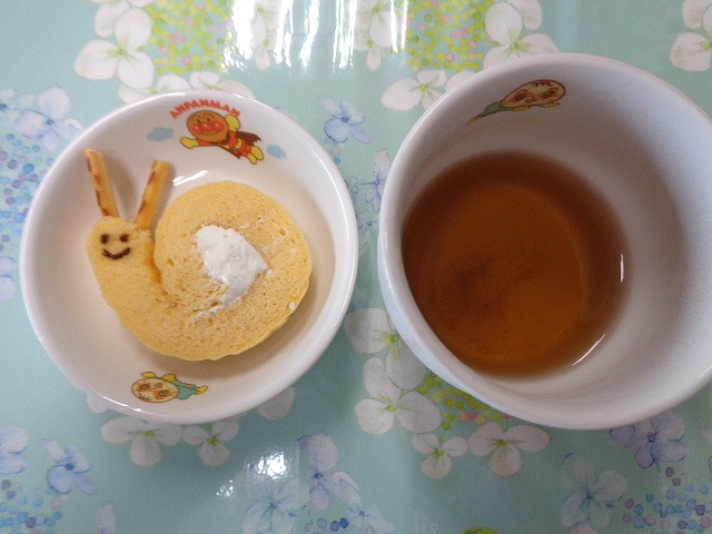 18日の給食は『冷やし中華・フルーツポンチ』で、おやつは『ケーキ・麦茶』でしたぴかぴか (新しい) 今日のケーキはかたつむりロールケーキですかたつむりバースデー