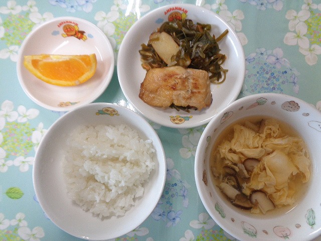 19日の給食は『さばのみそ焼き・すき昆布煮・かきたま汁・オレンジ』で、おやつは『チーズたこ焼き・牛乳』でしたうまい! (顔)