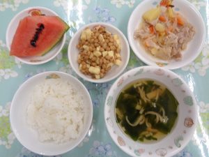 21日の給食『肉じゃが・チーズ納豆・すまし汁(えのき・わかめ・焼き麩)・スイカでした🍉