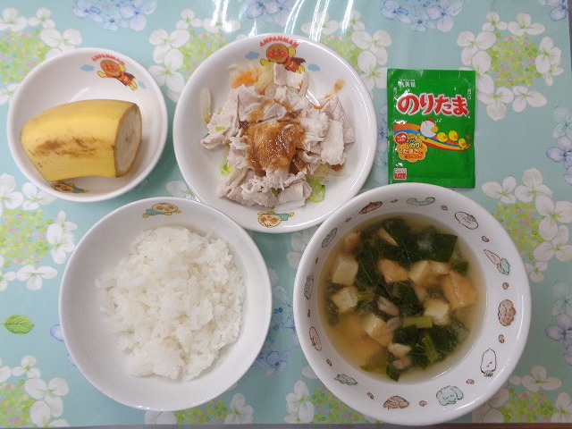 24日の給食は『冷しゃぶごまだれ・みそ汁(しめじ・小松菜・厚揚げ)・ふりかけ・バナナ』でした🍌