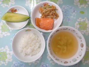 25日の給食は『鮭の照り焼き・炒り煮・みそ汁(キャベツ・椎茸)・メロン』で、おやつは『青のりポテト・牛乳』でした🐟